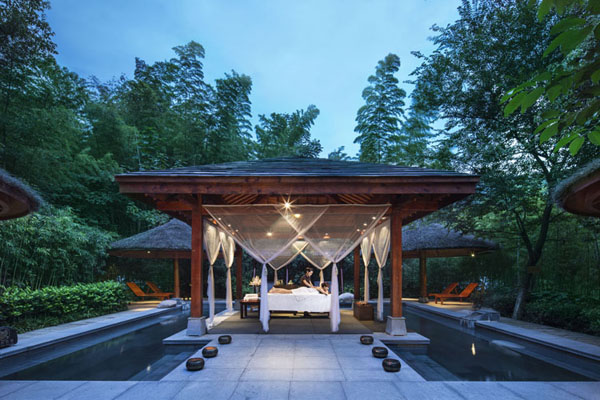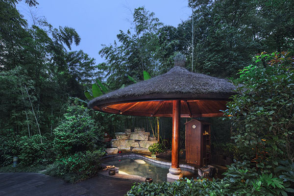 御水温泉,隐匿于3.5万亩竹海之中,既是取材于竹,自要将竹韵体现到极致,同时又得将自然之气全然保存。御水温泉将古树、翠竹、茅屋、长廊这 些元素巧妙结合,声气相投间,无不透露着风雅和诗意,而悠悠潺潺的热气蒸腾处,还能看到温泉边小小的泉眼,颇若藏在遗世独立佳人眼中的惊鸿一瞥,只须一 眼,便已让人醉到心里。