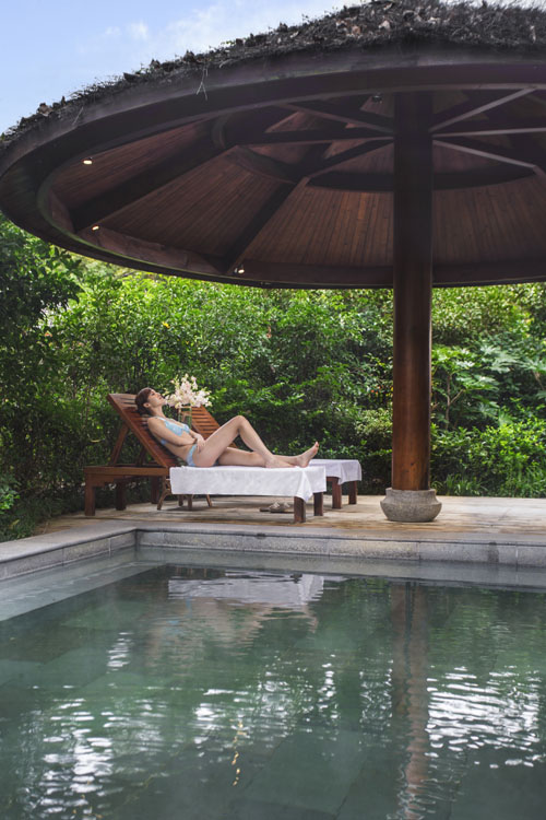 师法山水,自在一泡。想来中国古代的文人雅士,都善于在山野或江溪之畔营造自在居所,以求修身养心,营建之道必契合于山水,亭台楼阁均循身心舒适之道。御水温泉,隐匿于3.5万亩竹海之中,既是取材于竹,自要将竹韵体现到极致,又得将自然气息全然保存下来。御水温泉将古树、翠竹、茅屋、长廊这些元素巧妙结合,声气相投间,无不透露着风雅和诗意,而悠悠潺潺的热气蒸腾处,还能看到温泉边小小的泉眼,颇若藏在遗世独立佳人眼中的惊鸿一瞥,只须一眼,便已让人醉到心里。沐浴洁身后,披着浴袍信步在御水温泉,长廊蜿蜒曲折处,有着柳暗花明的抑扬先抑,风拂过耳,万亩竹海随风摇曳,这景色生辉的妙笔,带着份清幽,伴 着份娇媚,吹散所有的纷纷绕绕,繁华不再,便能享受云卷云舒的闲散自在了。