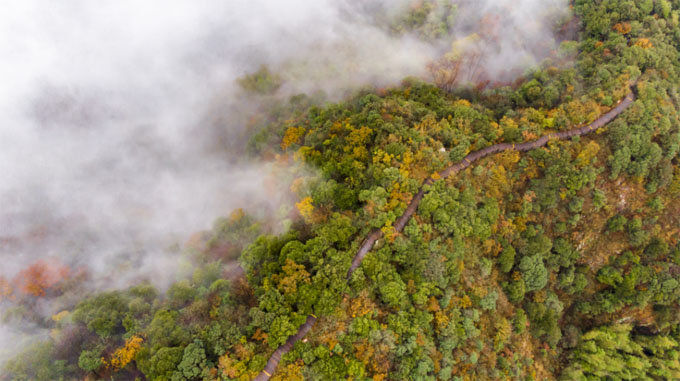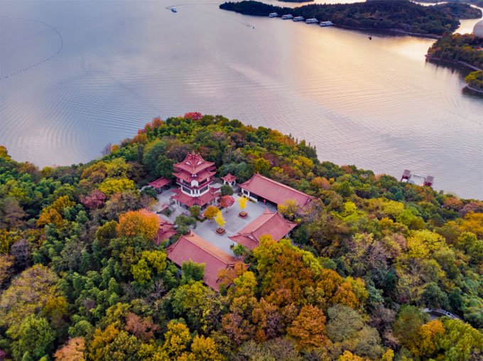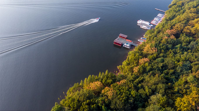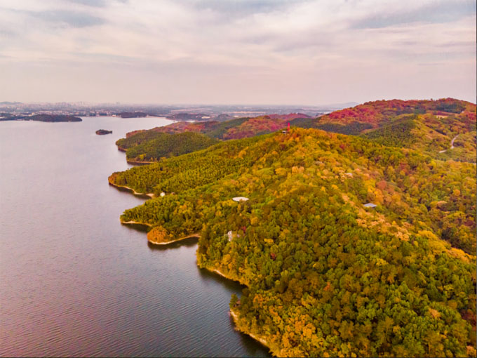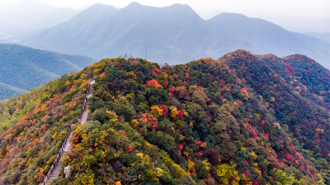一声新雁,天目湖的金秋如期而至,叠翠流金,枫叶流丹,仿佛是上帝打翻了手中的调色板,大自然呈现出“赤橙黄绿青蓝紫”多彩斑斓的颜色,组合成一幅幅秀美的金秋胜景图,心灵被秋日的艳阳沐浴,心潮也随之荡漾,在湖泊群山的绚烂秋景之中飞跃、疾走、腾云驾雾。瑰丽多姿的秋天里,再也没有什么比缤纷的色彩更具观赏性了,层林尽染,灿若朝霞,艳如壮锦,果真一叶而知秋。