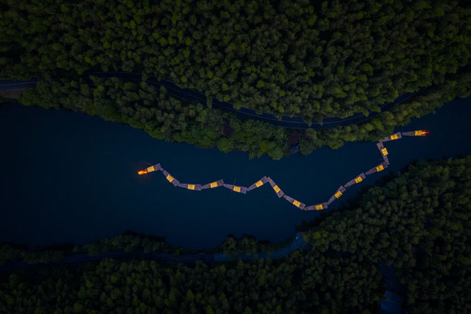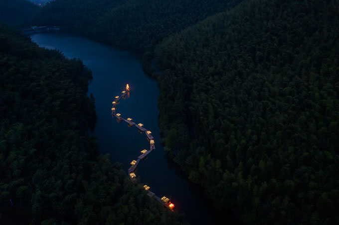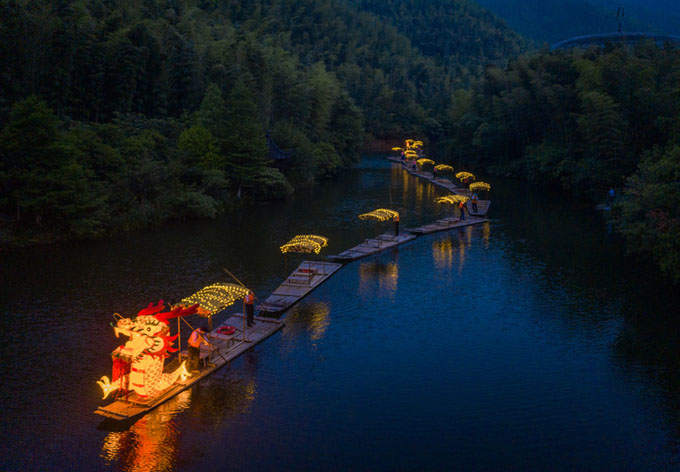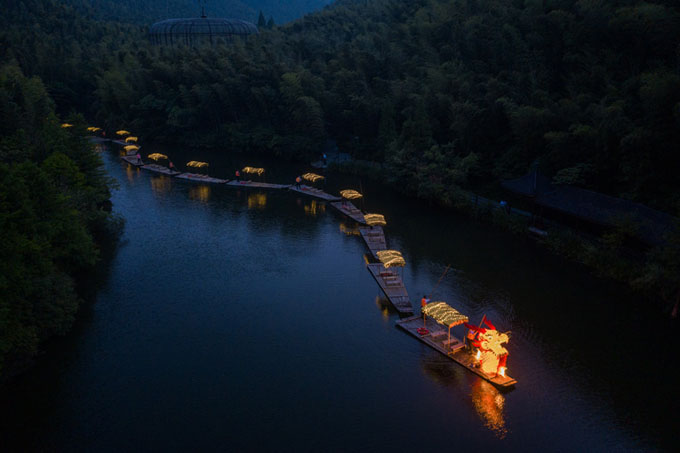 当夜幕降临,夜色给静湖拢上一层朦胧的面纱,属于竹海的妩媚风情徐徐呈现,勾勒出一幅盛世夜宴的画面。星云与灯光相印,龙船宛若一条巨龙伏卧山间,绽放流光华彩,让南山竹海的端午佳节,越“夜”越精彩。
