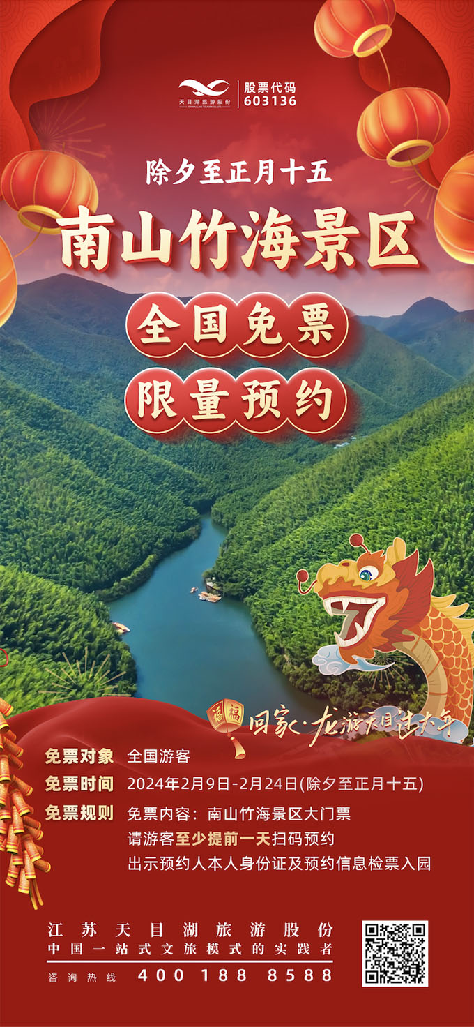 为丰富新年文化和旅游生活,满足人民群众对旅游休闲的需求,推动文化和旅游消费发展,共同营造欢乐喜庆的节日氛围。2024年春节2月9日-2月24日,天目湖旅游旗下两大国家5A级景区天目湖山水园和南山竹海,面向全国游客开展免门票政策。奏折盖章、非遗大戏、龙灯巡游、江湖奇市、仙子六礼……一场龙年新春盛宴正等待您来开启!